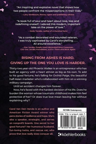 Recommended by Buzzfeed l Parade l Travel+Leisure l GLAMOUR. Winner: American Fiction Award l Pinnacle Achievement Award l Royal Dragonfly Disability Awareness l IAN Book of the Year l Chanticleer International Chatelaine 1st Place. "Carol Van Den Hende never disappoints. Her books are full of rich characters, real challenges and deep emotion." -KRISTAN HIGGINS, New York Times, USA TODAY, Publisher's Weekly bestselling author Can love blossom after life changes in an instant? One July morning in Manhattan, athlete and entrepreneur Phoenix Walker accompanies the woman he is falling for to her flight. Half-Asian beauty Orchid Paige is beginning to blossom into his partner in every way that matters. Neither believes today will be goodbye. But after she leaves, disaster strikes. Phoenix wakes in a hospital bed, his body broken and his future forever changed. As he struggles through recovery, his thoughts return to Orchid. But he knows the shadows in her past, the tragedy that makes her panic at the sight of trauma. Now he faces the hardest decision of his life. Should he fight to keep the woman he loves, risking re-traumatizing her, or should he walk away without explaining why? The choice feels impossible, and yet true love may mean breaking his own heart. Rising from ashes is hard. Giving up the one you love is harder. Told with the emotional depth of contemporary fiction and the heart of inspirational romance, Goodbye, Orchid is a love story rooted in resilience, sacrifice, and the belief that beauty can grow even from brokenness. Phoenix is a wounded hero, a man whose challenges mirror the courage of combat-injured veterans and whose journey will resonate with readers who value the authenticity found in disability fiction and amputee romance. Orchid's vibrant, multicultural identity adds richness to a connection that feels destined, yet fraught with the challenges of star-crossed lovers learning to trust again. Their story is one of longing and quiet strength, of choosing love even when the cost is high. For those who believe in the healing power of hope, and in love that protects as fiercely as it holds on, Goodbye, Orchid offers an unforgettable journey. Order your copy of Goodbye, Orchid today and experience a romance that lingers long after the last page. This is the first book published in Phoenix and Orchid's love story, and can be followed by the prequel, Orchid Blooming. Each book can be read on its own, and make sure to end with the sequel, Always Orchid, to deepen the emotional impact of their journey. Book 1: Goodbye, Orchid Book 2: Orchid Blooming (prequel) Book 3: Always Orchid (sequel, but can be read as standalone)