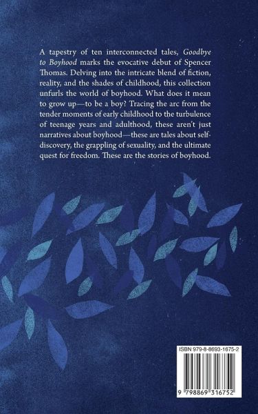 A tapestry of ten interconnected tales, Goodbye to Boyhood marks the evocative debut of Spencer Thomas. Delving into the intricate blend of fiction, reality, and the shades of childhood, this collection unfurls the world of boyhood. What does it mean to grow up? Tracing the arc from the tender moments of early childhood to the turbulence of teenage years and adulthood, these aren't just narratives about adolescence-these are tales about self-discovery, the grappling of sexuality, and the ultimate quest for freedom. These are the stories of boyhood.