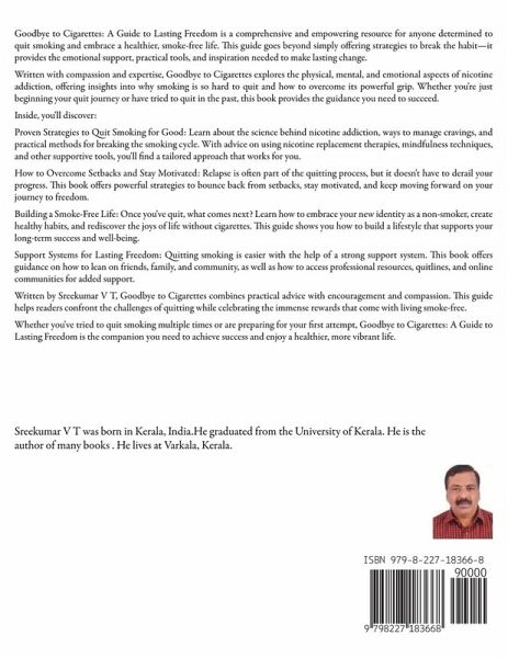 Goodbye to Cigarettes: A Guide to Lasting Freedom is a comprehensive and empowering resource for anyone determined to quit smoking and embrace a healthier, smoke-free life. This guide goes beyond simply offering strategies to break the habit-it provides the emotional support, practical tools, and inspiration needed to make lasting change. Written with compassion and expertise, Goodbye to Cigarettes explores the physical, mental, and emotional aspects of nicotine addiction, offering insights into why smoking is so hard to quit and how to overcome its powerful grip. Whether you're just beginning your quit journey or have tried to quit in the past, this book provides the guidance you need to succeed. Inside, you'll discover: Proven Strategies to Quit Smoking for Good: Learn about the science behind nicotine addiction, ways to manage cravings, and practical methods for breaking the smoking cycle. With advice on using nicotine replacement therapies, mindfulness techniques, and other supportive tools, you'll find a tailored approach that works for you. How to Overcome Setbacks and Stay Motivated: Relapse is often part of the quitting process, but it doesn't have to derail your progress. This book offers powerful strategies to bounce back from setbacks, stay motivated, and keep moving forward on your journey to freedom. Building a Smoke-Free Life: Once you've quit, what comes next? Learn how to embrace your new identity as a non-smoker, create healthy habits, and rediscover the joys of life without cigarettes. This guide shows you how to build a lifestyle that supports your long-term success and well-being. Support Systems for Lasting Freedom: Quitting smoking is easier with the help of a strong support system. This book offers guidance on how to lean on friends, family, and community, as well as how to access professional resources, quitlines, and online communities for added support. Written by Sreekumar V T, Goodbye to Cigarettes combines practical advice with encouragement and compassion. This guide helps readers confront the challenges of quitting while celebrating the immense rewards that come with living smoke-free. Whether you've tried to quit smoking multiple times or are preparing for your first attempt, Goodbye to Cigarettes: A Guide to Lasting Freedom is the companion you need to achieve success and enjoy a healthier, more vibrant life.