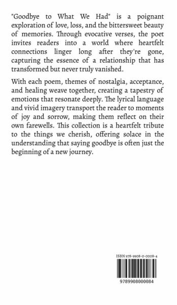 "Goodbye to What We Had" is a poignant exploration of love, loss, and the bittersweet beauty of memories. Through evocative verses, the poet invites readers into a world where heartfelt connections linger long after they're gone, capturing the essence of a relationship that has transformed but never truly vanished. With each poem, themes of nostalgia, acceptance, and healing weave together, creating a tapestry of emotions that resonate deeply. The lyrical language and vivid imagery transport the reader to moments of joy and sorrow, making them reflect on their own farewells. This collection is a heartfelt tribute to the things we cherish, offering solace in the understanding that saying goodbye is often just the beginning of a new journey.