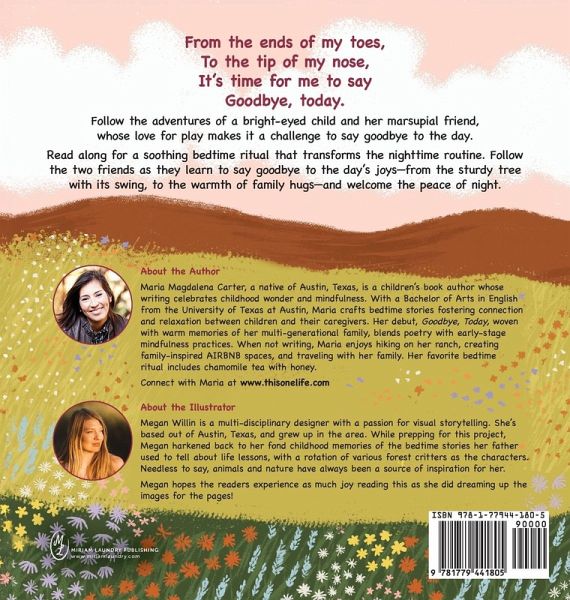 From the ends of my toes, To the tip of my nose, It's time for me to say Goodbye, today. Follow the adventures of a bright-eyed child and her marsupial friend, whose love for play makes it a challenge to say goodbye to the day. Read along for a soothing bedtime ritual that transforms the nighttime routine. Follow the two friends as they learn to say goodbye to the day's joys-from the sturdy tree with its swing, to the warmth of family hugs-and welcome the peace of night.