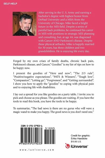 Forged by my own crises of family deaths, chronic back pain, Parkinson's disease, and Cancer," Goodies" is my list of tips on how to be happy now. I present the goodies of 'Here and now", 'The 2/3 rule", 'Positive/negative expectations", 'PATS & Winners", 'Tough love", 'Compassion", 'Letting go", 'Forgiveness", and 'Getting surrounded". I show you how to apply the 'goodies" to coping with physical pain and to enjoying life with disabilities. I lay out a spread for you like goodies on a party table. I invite you to pick and choose as you please. The goodies are waiting. If you have the tools to read this book, you have the tools to be happy. To summarize, 'The bad news is there are no gurus who will wave a magic wand to make you happy. The good news is you don't need one."