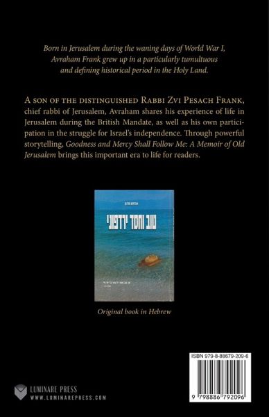 Born in Jerusalem during the waning days of World War I, Avraham Frank grew up in a particularly tumultuous and defining historical period in the Holy Land. A son of the distinguished Rabbi Zvi Pesach Frank, chief rabbi of Jerusalem, Avraham shares his experience of life in Jerusalem during the British Mandate, as well as his own participation in the struggle for Israel's independence. Through powerful storytelling, Goodness and Mercy Shall Follow Me: A Memoir of Old Jerusalem brings this important era to life for readers.