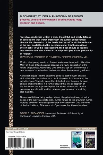 Most contemporary versions of moral realism are beset with difficulties. Many of these difficulties arise because of a faulty conception of the nature of goodness. Goodness, God, and Evil lays out and defends a new version of moral realism that re-conceives the nature of goodness. Alexander argues that the adjective 'good' is best thought of as an attributive adjective and not as a predicative one. In other words, the adjective 'good' logically cannot be detached from the noun (or noun phrase) that it modifies. It is further argued that this conception of the function of the adjective implies that recent attempts to provide necessary a posteriori identities between goodness and something else must fail. The convertibility of being and goodness, the privation theory of evil, a denial of the fact-value distinction, human nature as the ground of human morality and even a novel argument for the existence of God are some of the implications of the account of goodness that Alexander offers.