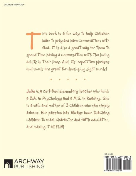 This book is a fun way to help children learn to pray and have conversations with God. It is also a great way for them to spend time having a conversation with the loving adults in their lives. And, its' repetitive phrases and words are great for developing sight words!