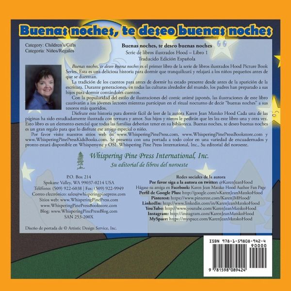 This translated edition of Goodnight, I Wish You Goodnight, Translated Spanish Edition is translated and published in Spanish. It is a delightful soothing bedtime story to relax young children before they fall asleep. The tradition of the bedtime story has been around since before the written word. For generations, and in every culture around the world, parents have prepared their children for bed by telling them stories. Goodnight, I Wish You Goodnight, Translated Spanish Edition is a soothing bedtime story to be told and retold. With the popularity of Japanese Anime cartoon styles, the artwork in this book will entertain young readers as they participate in the nighttime ritual of saying "goodnight" to all of their beloved treasures. Enjoy this easy-to-read bedtime story by author Karen Jean Matsko Hood. Each one of the pages is thoughtfully illustrated with warmth and love. Your children and grandchildren will ask you to read this book to them again and again. This book is a must for all families to have in their library. Goodnight, I Wish You Goodnight, Translated Spanish Edition makes a great gift for that special friend or child to enjoy.