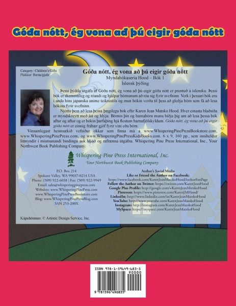 Þessi útgáfa Góða nótt, ég vona að þú eigir góða nótt er prentuð á íslensku. Hún er róandi og skemmtileg og hjálpar til við að róa börnin áður en þau fara að sofa. Hefðin að baki sögu fyrir svefninn hefur verið við líði samhliða hinu skrifaða orði. Í gegnum margar kynslóðir, í öllum menningarheimum hafa foreldrar lesið fyrir börnin sín fyrir svefninn. Góða nótt, ég vona að þú eigir góða nótt er sefandi saga fyrir svefninn sem hægt er að segja aftur og aftur. Í kjölfar fordæmislausum vinsældum japanska Anime teiknimyndastíls munu myndirnar í þessari bók skemmta ungum lesendum er þeir taka þátt í helgiathöfn háttatímans og bjóða öllum fjársjóðum sínum góða nótt. Börn munu njóta þess að lesa þessa þægilegu sögu fyrir háttinn eftir Karen Jean Matsko Hood. Hver síða er myndskreytt með ást og eljusemi. Barnið þitt og barnabarn munu biðja þig um að lesa þessa bók aftur og aftur. Þessi bók er algjört skilyrði fyrir allar fjölskyldur sem halda úti safni bóka. Góða nótt, ég vona að þú eigir góða nótt er frábær gjöf fyrir alla sérstaka vini og börn.