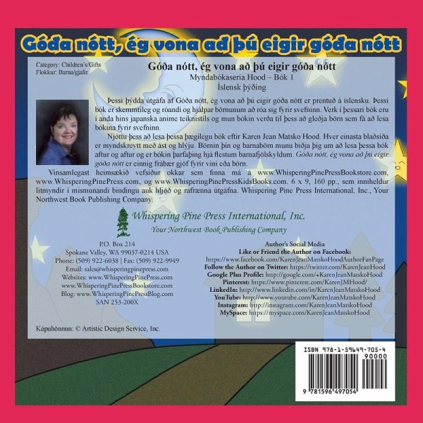 Þessi útgáfa Góða nótt, ég vona að þú eigir góða nótt er prentuð á íslensku. Hún er róandi og skemmtileg og hjálpar til við að róa börnin áður en þau fara að sofa. Hefðin að baki sögu fyrir svefninn hefur verið við líði samhliða hinu skrifaða orði. Í gegnum margar kynslóðir, í öllum menningarheimum hafa foreldrar lesið fyrir börnin sín fyrir svefninn. Góða nótt, ég vona að þú eigir góða nótt er sefandi saga fyrir svefninn sem hægt er að segja aftur og aftur. Í kjölfar fordæmislausum vinsældum japanska Anime teiknimyndastíls munu myndirnar í þessari bók skemmta ungum lesendum er þeir taka þátt í helgiathöfn háttatímans og bjóða öllum fjársjóðum sínum góða nótt. Börn munu njóta þess að lesa þessa þægilegu sögu fyrir háttinn eftir Karen Jean Matsko Hood. Hver síða er myndskreytt með ást og eljusemi. Barnið þitt og barnabarn munu biðja þig um að lesa þessa bók aftur og aftur. Þessi bók er algjört skilyrði fyrir allar fjölskyldur sem halda úti safni bóka. Góða nótt, ég vona að þú eigir góða nótt er frábær gjöf fyrir alla sérstaka vini og börn.