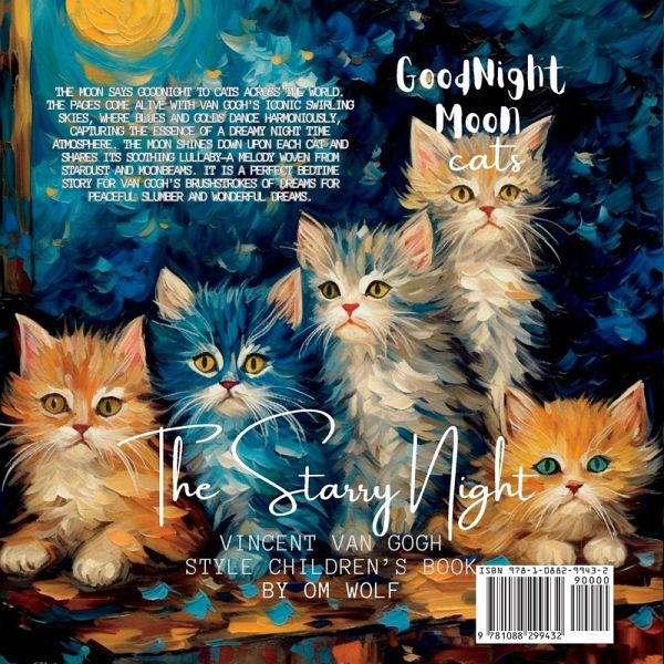 Step into the mesmerizing realm of "Goodnight Moon Cats," a children's book that melds the captivating charm of Vincent van Gogh's "Starry Night" with an imaginative tale of felines and the moon. This enchanting story unfolds as the moon, transformed into a nurturing companion, embarks on a mission to bid goodnight to cats across the world. The pages come alive with Van Gogh's iconic swirling skies, where blues and golds dance harmoniously, capturing the essence of a dreamy night time atmosphere. The moon shines down upon each cat and shares its soothing lullaby-a melody woven from stardust and moonbeams. From mischievous kittens to wise old cats, every feline friend receives the moon's whispered goodnight, delivered with a touch of cosmic wonder. Through lyrical prose and breathtaking illustrations that mirror the swirling beauty of "Starry Night," readers are transported to a world where imagination and reality blend seamlessly. It is more than just a bedtime story; it's an artistic exploration of the connection between the natural world and our furry companions. It encourages young readers to contemplate the mysteries of the universe while cherishing the everyday moments shared with their pets. As the moon continues its nocturnal rounds, it teaches us that even in the vastness of the cosmos, there's always room for tender moments and dreams. It is a perfect bedtime story for Van Gogh's Brushstrokes of Dreams for peaceful slumber and wonderful dreams.