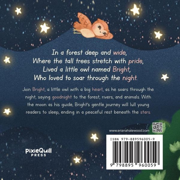 Goodnight Moonlight Flight is a charming bedtime story that takes readers on a peaceful journey with Bright, a little owl who loves to explore the night. As Bright soars through the moonlit sky, he bids goodnight to rivers, mountains, animals, and the sleepy forest below. Each stop along his journey brings a calming, rhythmic farewell to the world around him. Guided by the glowing moon, Bright's gentle adventure leads him to his favorite tree, where he tucks in his wings and finds rest. This beautifully illustrated tale, filled with soft, lyrical text, is perfect for soothing young readers as they drift off to sleep, creating a magical and peaceful end to the day. Ideal for bedtime routines, Goodnight Moonlight Flight is sure to become a favorite for children and parents alike.