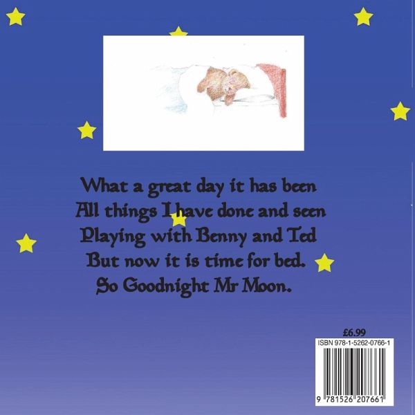 WHAT A GREAT DAY IT HAS BEEN, ALL THINGS I HAVE DONE AND SEEN. PLAYING WITH BENNY AND TED, BUT NOW IT IS TIME FOR BED. SO GOODNIGHT MR MOON. It is time for bed and your little one is feeling very sleepy. Mr Moon is outside, peering in through the window. With a yawn, snuggle down into your comfy covers and get ready to go to sleep. Goodnight Mr Moon is a charming bedtime story with its rhyming wording and full of the beautiful, hand drawn illustrations from Wendy Trinder, this story will sure put your little ones to a peaceful and dreamful sleep.