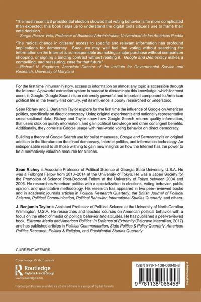 For the first time in human history, access to information on almost any topic is accessible through the Internet. A powerful extraction system is needed to disseminate this knowledge, which for most users is Google. Google Search is an extremely powerful and important component to American political life in the twenty-first century, yet its influence is poorly researched or understood. Sean Richey and J. Benjamin Taylor explore for the first time the influence of Google on American politics, specifically on direct democracy. Using original experiments and nationally representative cross-sectional data, Richey and Taylor show how Google Search returns quality information, that users click on quality information, and gain political knowledge and other contingent benefits. Additionally, they correlate Google usage with real-world voting behavior on direct democracy. Building a theory of Google Search use for ballot measures, Google and Democracy is an original addition to the literature on the direct democracy, Internet politics, and information technology. An indispensable read to all those wishing to gain new insights on how the Internet has the power to be a normatively valuable resource for citizens.