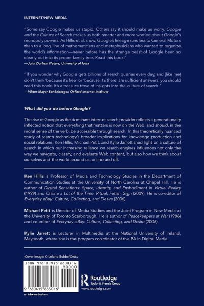 Ken Hillis, Michael Petit, and Kylie Jarrett seek to understand the ascendancy of search and its naturalization by historicizing and contextualizing Google's dominance of the search industry, and suggest that the contemporary culture of search is inextricably bound up with a metaphysical longing to manage, order, and categorize all knowledge. Calling upon this nexus between political economy and metaphysics, Google and the Culture of Search explores what is at stake for an increasingly networked culture in which search technology is a site of knowledge and power.