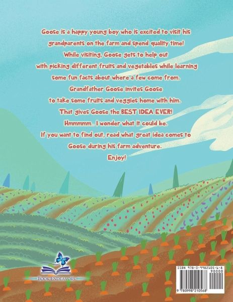 Goose is a happy young boy who is excited to visit his grandparents on the farm and spend quality time! While visiting, Goose gets to help out with picking different fruits and vegetables while learning some fun facts about where a few come from. Grandfather Goose invites Goose to take some fruits and veggies home with him. That gives Goose the BEST IDEA EVER! Hmmmmm... I wonder what it could be. If you want to find out, read what great idea comes to Goose during his farm adventure. Enjoy!