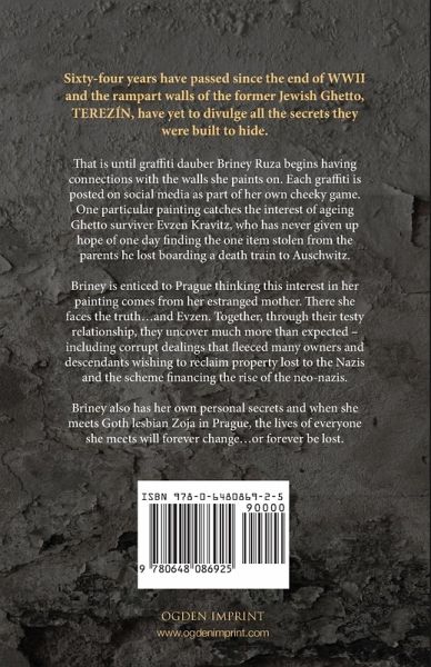 Sixty-four years have passed since the end of WWII and the rampart walls of the former Jewish Ghetto, TEREZÍN, have yet to divulge all the secrets they were built to hide. That is until graffiti dauber Briney Ruza begins having connections with the walls she paints on. Each graffiti is posted on social media as part of her own cheeky game. One particular painting catches the interest of ageing Ghetto surviver Evzen Kravitz, who has never given up hope of one day finding the one item stolen from the parents he lost boarding a death train to Auschwitz. Briney is enticed to Prague thinking this interest in her painting comes from her estranged mother. There she faces the truth…and Evzen. Together, through their testy relationship, they uncover much more than expected - including corrupt dealings that fleeced many owners and descendants wishing to reclaim property lost to the Nazis and the scheme financing the rise of the neo-nazis. Briney also has her own personal secrets and when she meets Goth lesbian Zoja in Prague, the lives of everyone she meets will forever change…or forever be lost.