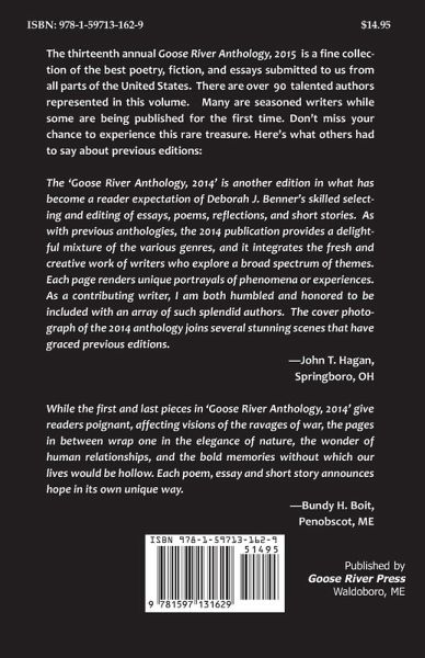 The thirteenth annual Goose River Anthology, 2015 is a fine collection of the best poetry, fiction, and essays submitted to us from all parts of the United States. There are over 90 talented authors represented in this volume. Many are seasoned writers while some are being published for the first time. Don't miss your chance to experience this rare treasure. Here's what others had to say about previous editions: The 'Goose River Anthology, 2014' is another edition in what has become a reader expectation of Deborah J. Benner's skilled selecting and editing of essays, poems, reflections, and short stories. As with previous anthologies, the 2014 publication provides a delightful mixture of the various genres, and it integrates the fresh and creative work of writers who explore a broad spectrum of themes. Each page renders unique portrayals of phenomena or experiences. As a contributing writer, I am both humbled and honored to be included with an array of such splendid authors. The cover photograph of the 2014 anthology joins several stunning scenes that have graced previous editions. -John T. Hagan, Springboro, OH While the first and last pieces in 'Goose River Anthology, 2014' give readers poignant, affecting visions of the ravages of war, the pages in between wrap one in the elegance of nature, the wonder of human relationships, and the bold memories without which our lives would be hollow. Each poem, essay and short story announces hope in its own unique way. -Bundy H. Boit, Penobscot, ME