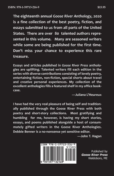 The eighteenth annual Goose River Anthology, 2020 is a fine collection of the best poetry, fiction, and essays submitted to us from all parts of the United States. There are over 80 talented authors represented in this volume. Many are seasoned writers while some are being published for the first time. Don't miss your chance to experience this rare treasure. Essays and articles published in Goose River Press anthologies are uplifting. Talented writers fill each edition in the series with diverse contributions consisting of lovely poetry, entertaining fiction, non-fiction, special shorts about travel and creative personal experiences. My collection of the excellent anthologies fills a featured shelf in my office bookcase. -Juliana L'Heureux I have had the very real pleasure of being self and traditionally published through the Goose River Press with both poetry and short-story collections. Most gratifying and humbling for me, however, is having my short stories, essays, and poems published alongside a host of consummately gifted writers in the Goose River Anthologies. Debbie Benner is a no-nonsense yet sensitive editor. -John T. Hagan Deborah J. Benner has been in the publishing industry since 1985 and created Goose River Press in 1999. The first Goose River Anthology was published in 2003. Goose River Press publishes a wide array of genres including but not limited to: poetry, short stories, novels, children's books, cookbooks, workbooks, anthologies, and more.