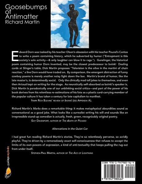 Edward Dorn was tasked by his teacher Olson’s obsession with his teacher Pound’s Cantos to write a poem containing history, which he subverted by humor ("Entrapment is this society’s sole activity--& only laughter can blow it to rags."). Gunslinger, the historical poem containing humor Dorn invented, may be the closest predecessor to boink! Dealing cards at Slinger’s table, Dick Martin proposes "Television is the olive in the martini of chain reaction," a line Dorn would have traded on. By comparison, the emergent distraction of funny cowboy poems is merely another noisy fight down the bar. Martin’s brand of humor, like the late master’s, is determinedly social. Only the clinically mad tell jokes to themselves, and even then Artaud kept on writing for the stage. As neurotically self-absorbed as boink!’s speaker is, Dick Martin is paradoxically one of our unblinking social critics—and part of the power of his book derives from his relentless re-estimations of his fate as a plastic card-carrying member of the popular culture it has taken a century for late capitalism to manifest. from Rich Blevins' review of boink! (see Appendix A) Richard Martin’s Marks does a remarkable thing: it makes metaphysical absurdities sound as conversational as a good joke. What looks like a surrealist writing his will and sounds like an irrepressible stand-up comedian is actually, fresh, green, recognizably original poetry. Guy Davenport, author of The death of Picasso I had great fun reading Richard Martin’s stories. They’re so relentlessly perverse, so acridly playful. They’re driven by a remorselessly exact self-consciousness that refuses to accept the limits of its own powers of expression, a kind of anti-textuality that keeps pulling the rug out from under itself. Stephen-Paul Martin, author of The Ace of Lightning