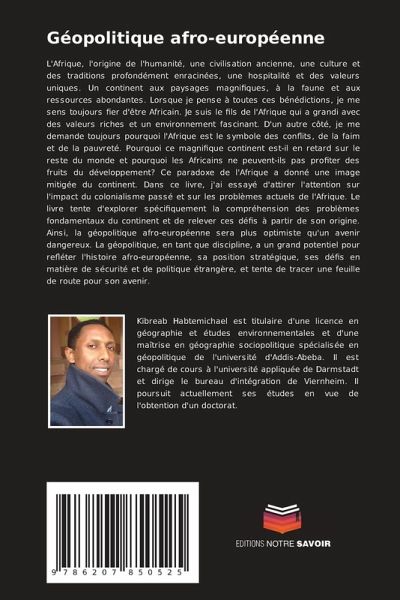L'Afrique, l'origine de l'humanité, une civilisation ancienne, une culture et des traditions profondément enracinées, une hospitalité et des valeurs uniques. Un continent aux paysages magnifiques, à la faune et aux ressources abondantes. Lorsque je pense à toutes ces bénédictions, je me sens toujours fier d'être Africain. Je suis le fils de l'Afrique qui a grandi avec des valeurs riches et un environnement fascinant. D'un autre côté, je me demande toujours pourquoi l'Afrique est le symbole des conflits, de la faim et de la pauvreté. Pourquoi ce magnifique continent est-il en retard sur le reste du monde et pourquoi les Africains ne peuvent-ils pas profiter des fruits du développement? Ce paradoxe de l'Afrique a donné une image mitigée du continent. Dans ce livre, j'ai essayé d'attirer l'attention sur l'impact du colonialisme passé et sur les problèmes actuels de l'Afrique. Le livre tente d'explorer spécifiquement la compréhension des problèmes fondamentaux du continent et de relever ces défis à partir de son origine. Ainsi, la géopolitique afro-européenne sera plus optimiste qu'un avenir dangereux. La géopolitique, en tant que discipline, a un grand potentiel pour refléter l'histoire afro-européenne, sa position stratégique, ses défis en matière de sécurité et de politique étrangère, et tente de tracer une feuille de route pour son avenir.