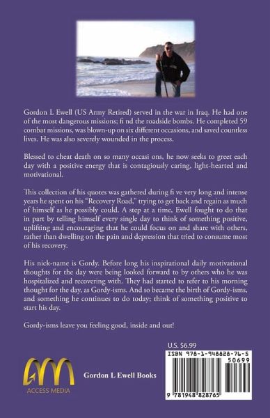 This collection of his quotes was gathered during five very long and intense years he spent on his "Recovery Road," trying to get back and regain as much of himself as he possibly could. A step at a time, Ewell fought to do that in part by telling himself every single day to think of something positive, uplifting and encouraging that he could focus on and share with others, rather than dwelling on the pain and depression that tried to consume most of his recovery. His nick-name is Gordy. Before long his inspirational daily motivational thoughts for the day were being looked forward to by others who he was hospitalized and recovering with. They had started to refer to his morning thought for the day, as Gordy-isms. And so became the birth of Gordy-isms, and something he continues to do today; think of something positive to start his day.