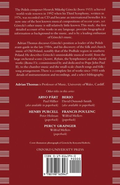 The Polish composer Henry Górecki (born 1933) achieved world-wide renown in 1992 when his Third Symphony, written in 1976, was recorded on CD and became an international bestseller. It is now one of the best known musical compositions of recent years, yet Górecki's other music is still relatively little known. This study, the first detailed account of his works in any language, provides biographical information as background to the music, and is by a leading enthusiast of Górecki's music. Adrian Thomas discusses Górecki's position as leader of the Polish avant-garde in the late 1950s, and his subsequent discovery of the folk and church music of Old Poland, notably that of the Podhale region in southern Poland. He describes Górecki's unmistakable musical world, from the large orchestral scores (Scontri, Refrain, the Symphonies) and the choral works ( Beatus Vir, commissioned by and dedicated to Pope John Paul II), to the more modest church songs and folk-song arrangements. There is a complete list of works since 1955 with details of instrumentation and recordings, and a select bibliography.