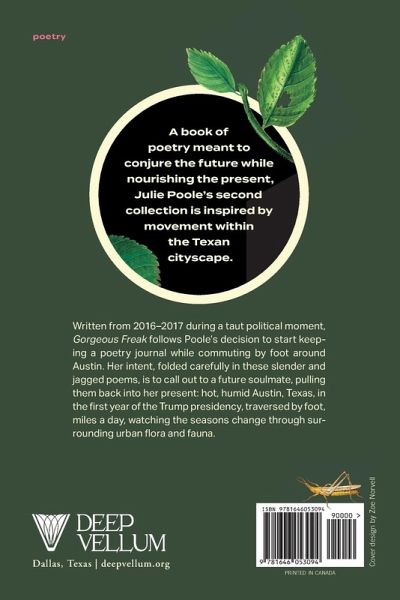 "A book of poetry meant to conjure the future while nourishing the present, Julie Poole's second collection is inspired by movement within a Texan cityscape. Written 2016-2017 during a taut political moment, Gorgeous Freak follows Poole's decision to start keeping a poetry journal while commuting by foot around Austin. Her intent, folded carefully in these slender and jagged poems, is to call out to a future soulmate, pulling them back into her present: hot, humid Austin, Texas in the first year of the Trump presidency, traversed by foot miles a day, watching the seasons change through surrounding urban flora and fauna"--