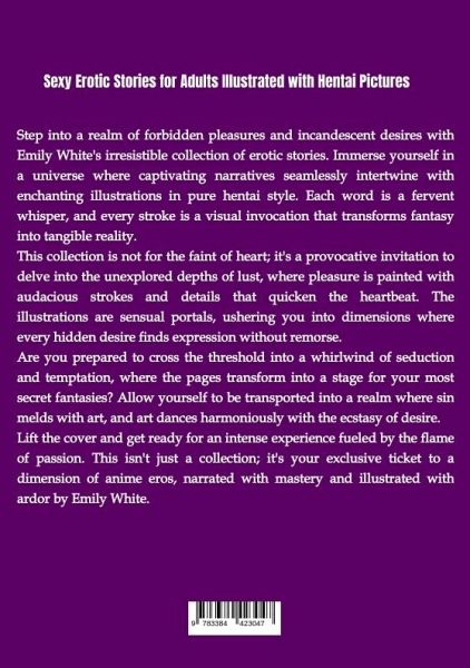Indulge in an Unforgettable Journey of Passion and Temptation with Emily White's Erotic Masterpiece!Step into a captivating world where seduction knows no bounds in Emily White's latest collection of scintillating erotic stories, enriched with enchanting hentai illustrations. Immerse yourself in a universe where each word is a whispered promise, and every brushstroke is a visual enchantment that brings fantasies to life in pure hentai style.This collection is a daring invitation to explore the uncharted depths of desire, where pleasure unfolds with audacious strokes and details that will quicken your heartbeat. The carefully crafted hentai illustrations serve as sensuous portals, transporting you into dimensions where every hidden fantasy finds unabashed expression.What to Expect:- A Fusion of Literary Mastery and Sensual Artistry- Explicit and Alluring Hentai Illustrations- Stories That Explore the Boundaries of Lust and Fantasy- A Whirlwind of Seduction and TemptationThis isn'tjust a collection; it's your exclusive ticket to a dimension of hentai eros, meticulously narrated and ardently illustrated by Emily White. Lift the cover and prepare for an intense experience fueled by the flame of passion.Caution: This Collection is Not for the Faint of Heart. Are You Ready to Cross the Threshold?