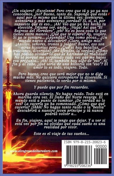 "¿Un viajero? ¡Excelente! Pero creo que tú y yo ya nos conocemos, ¿no? Bueno, tanto da. Supongo que estás aquí por lo mismo que la última vez: aventuras, aventuras y más aventuras ¿verdad? Sí, sí, sí, por supuesto que es eso... ¡Ah! Veo que ya has hecho tu elección. Déjame ver, anda... ¡Vaya! Así que "El Regreso del Heredero", ¿eh? No es poca cosa lo que tienes entre manos.. ¿Qué te espera? Ay, viajero. Si yo te contara... ¿Leyendas? Una como pocas... ¿Un mundo nuevo a descubrir? ¡Claro, amigo mío! ¿Anillos, señores, tronos y juegos? Bueno, eso son otras historias pero... ¿Qué si hay batallas, traiciones, diversión? ¡Me ofendes, la verdad! ¿Cómo has podido olvidar lo que es Kárindor en realidad? No sé porqué me sorprendo cada vez que me haces esa pregunta... ¡Ah! Sí, también hay algo de "eso". Al fin y al cabo, ¿qué sería de una historia sin "eso"? El amor lo es todo, viajero. Todo. Pero bueno, creo que será mejor que no te diga mucho más. No quisiera estropearte la diversión. Si tienes paciencia, lo verás por ti mismo. Y puede que por fin recuerdes. Ahora guarda silencio. No hagas ruido. Todo está en marcha otra vez. Resurge El Daño del Norte. El mundo está a punto de cambiar. ¿De verdad no lo ves? La cacería ya ha comenzado. ¿Cómo que qué cacería? ¡Shhh! No hagas tanto ruido o la "bestia" descubrirá a nuestro joven príncipe y tú nunca podrás volver a... En fin, viajero, aquí te tengo que dejar. Y a ver si esta vez por fin no olvidas que cada sueño es una realidad por vivir. Este es el viaje de tus sueños..." ¿¿¿¿¿¿¿¿¿¿ "Una historia llena de fantasía, es la clase de libros que amo leer. La narración va llevando al lector, hoja a hoja a adentrarse cada vez más en la historia. Atravesando diferentes escenarios donde recrea luchas y aventuras de las buenas! Y a montones, puedo asegurarles que no se aburrirán, ya que el autor sabe cómo mantener el interés en lectura. Más que recomendado para todos los amantes del género de la fantasía épica. Sin dudas será agregado a mi lista de libros favoritos." Lily.G Rafferty "Uno de esas sagas que va de menos a más hasta que al final descubres que estás totalmente enganchado." Juan Pedro