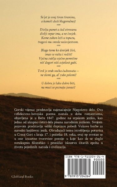 Gorski vijenac predstavlja najznacajnije Njegosevo delo. Ova refleksivno-herojska poema nastala u doba romantizma, objavljena je u Becu 1847. godine na srpskom jeziku, kao jedno od ukupno cetiri dela pisana narodnim jezikom. Svojom pojavom predstavlja veliki doprinos pobedi Vukove borbe za narodni knjizevni jezik. Obräujuci temu istrebljenja poturica u Crnoj Gori s kraja 17. i pocetka 18. veka, ovaj ep svrstao se u one izuzetne tvorevine poezije u koje kao da se sleglo sveukupno filozofsko i pesnicko iskustvo citavih epoha u zivotu pojedinih naroda i civilizacija. ----- Njegos's epic¿dramatic poem-arguably the central work of South¿Slavic literature-unites folk cadence, philosophy and the ethics of resistance. Set amid the struggle against Ottoman rule, The Mountain Wreath is less a straightforward narrative than a choral meditation on freedom, honor, faith and the fate of a small nation. This accessible edition presents the poem in its full sweep for students, general readers and anyone drawn to world epics that still think through the present.