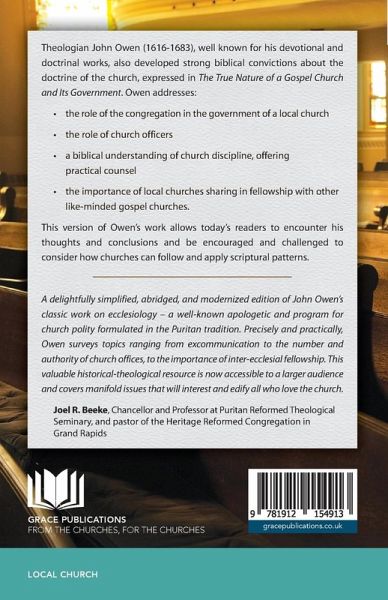 Theologian John Owen (1616-1683), well known for his devotional and doctrinal works, also developed strong biblical convictions about the doctrine of the church, expressed in The True Nature of a Gospel Church and Its Government. Owen addresses the role of the congregation in the government of a local church the role of church officers a biblical understanding of church discipline, offering practical counsel the importance of local churches sharing in fellowship with other like-minded gospel churches. This simplified and abridged version of Owen's work allows today's readers to encounter his thoughts and conclusions and be encouraged and challenged to consider how churches can follow and apply scriptural patterns.
