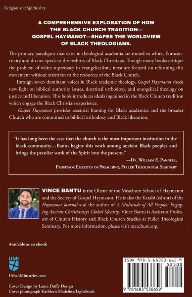 A COMPREHENSIVE EXPLORATION OF HOW THE BLACK CHURCH TRADITION - GOSPEL HAYMANOT - SHAPES THE WORLDVIEW OF BLACK THEOLOGIANS. The primary paradigms that exist in theological academia are rooted in white, Eurocentricity and do not speak to the realities of Black Christians. Though many books critique the problem of white supremacy in evangelicalism, most are focused on reforming this movement without attention to the resources of the Black Church. Through seven dominant voices in Black academic theology, Gospel Haymanot sheds new light on biblical authority issues, doctrinal orthodoxy, and evangelical theology on justice and liberation. This book introduces ideals ingrained in the Black Church tradition which engage the Black Christian experience. Gospel Haymanot provides essential framing for Black academics and the broader Church who are committed to biblical orthodoxy and Black liberation. "It has long been the case that the church is the most important institution in the black community...Bantu begins this work among ancient Black peoples and brings the peculiar work of the Spirit into the present." -DR. WILLIAM E. PANNELL, Professor Emeritus of Preaching, Fuller Theological Seminary