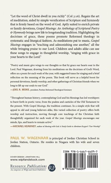 ""Let the word of Christ dwell in you richly"" (Col 3:16). Regain the art of meditation, aided by simple versification of Scripture and hymnody that is firmly based on the word of God. Aptly suited to enrich private or family devotions, Gospel Musings: An Anthology of Scriptural Poetry & Hymnody brings new life to longstanding tradition. Highlighting the doctrines of grace, these poems promote Reformed theology in systematic and liturgical fashion. As meditations put to music, Gospel Musings engages in ""teaching and admonishing one another,"" all the while bringing praise to our Lord. Children and adults alike can use these songs to engage in thoughtful worship, ""singing with grace in your hearts to the Lord.""