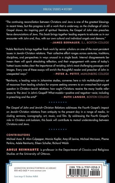 Introduction: The Gospel of John in Jewish-Christian Relations -- Adele Reinhartz Part I: Reading John 1.Erasure of "the Jews" in the Farewell Discourses and Johannine Epistles: Gnostic Connections? -- Pheme Perkins 2.The Eastern Orthodox Tradition, Jews, and the Gospel of John --Michael Azar Part II: Preaching John 3.Preaching the Hostile References to "the Jews" in the Gospel of John --R. Alan Culpepper 4.Reading the Gospel of John in the Catholic Lectionary --Eileen Schuller 5.Christian Privilege, Christian Fragility, and the Gospel of John --Amy-Jill Levine Part III: Re-presenting John 6.Ecclesia and Synagoga In Principio: The Fourth Gospel as Resource for Anti-Jewish Visual Polemic -- Marcia Kupfer 7.Two Bach Church Cantatas and "the Jews" in the Gospel of John -- Michael Marissen 8."My Kingdom Is Not of This World": Johannine Jesus Films and Christian Supersessionism -- Richard Walsh
