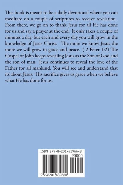 This book is meant to be a daily devotional where you can meditate on a couple of scriptures to receive revelation. From there we go on to thank Jesus for all He has done for us and say a prayer at the end. It only takes a couple of minutes a day, but each and every day you will grow in the knowledge of Jesus Christ. The more we know Jesus the more we will grow in grace and peace. ( 2 Peter 1:2) the Gospel of John keeps revealing Jesus as the Son of God and the son of man. Jesus continues to reveal the love of the father for all mankind. You will see and understand that it¿ about Jesus. His sacrifice gives us grace when we believe what he has done for us.
