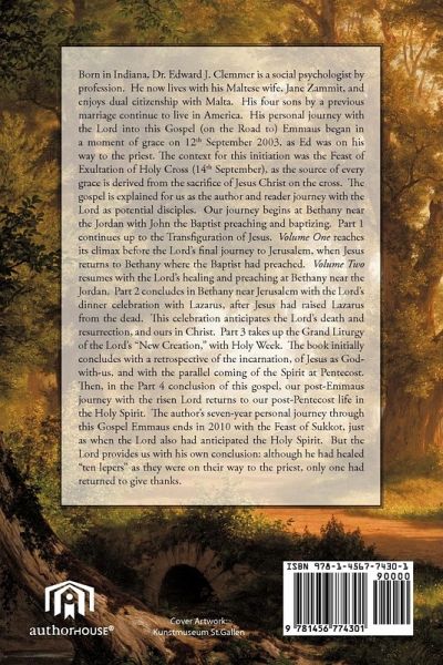 Born in Indiana, Dr. Edward J. Clemmer is a social psychologist by profession. He now lives with his Maltese wife, Jane Zammit, and enjoys dual citizenship with Malta. His four sons by a previous marriage continue to live in America. His personal journey with the Lord into this Gospel (on the Road to) Emmaus began in a moment of grace on 12th September 2003, as Ed was on his way to the priest. The context for this initiation was the Feast of Exultation of Holy Cross (14th September), as the source of every grace is derived from the sacrifice of Jesus Christ on the cross. The gospel is explained for us as the author and reader journey with the Lord as potential disciples. Our journey begins at Bethany near the Jordan with John the Baptist preaching and baptizing. Part 1 continues up to the Transfiguration of Jesus. Volume One reaches its climax before the Lord's final journey to Jerusalem, when Jesus returns to Bethany where the Baptist had preached. Volume Two resumes with the Lord's healing and preaching at Bethany near the Jordan. Part 2 concludes in Bethany near Jerusalem with the Lord's dinner celebration with Lazarus, after Jesus had raised Lazarus from the dead. This celebration anticipates the Lord's death and resurrection, and ours in Christ. Part 3 takes up the Grand Liturgy of the Lord's "New Creation," with Holy Week. The book initially concludes with a retrospective of the incarnation, of Jesus as God-with-us, and with the parallel coming of the Spirit at Pentecost. Then, in the Part 4 conclusion of this gospel, our post-Emmaus journey with the risen Lord returns to our post-Pentecost life in the Holy Spirit. The author's seven-year personal journey through this Gospel Emmaus ends in 2010 with the Feast of Sukkot, just as when the Lord also had anticipated the Holy Spirit. But the Lord provides us with his own conclusion: although he had healed "ten lepers" as they were on their way to the priest, only one had returned to give thanks.