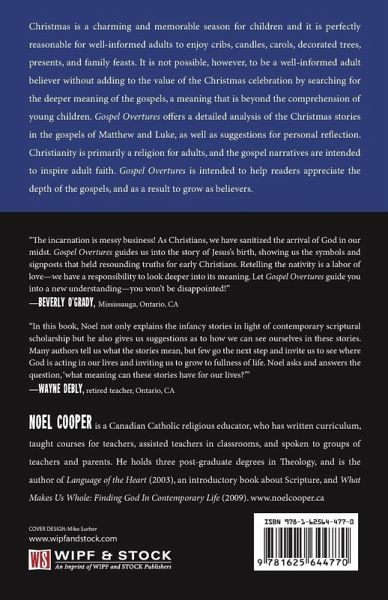 Christmas is a charming and memorable season for children, and it is perfectly reasonable for well-informed adults to enjoy cribs, candles, carols, decorated trees, presents, and family feasts. It is not possible, however, to be a well-informed adult believer without adding to the value of the Christmas celebration by searching for the deeper meaning of the gospels, a meaning that is beyond the comprehension of young children. Gospel Overtures offers a detailed analysis of the Christmas stories in the Gospels of Matthew and Luke, as well as suggestions for personal reflection. Christianity is primarily a religion for adults, and the gospel narratives are intended to inspire adult faith. Gospel Overtures is intended to help readers appreciate the depth of the gospels and to grow as believers.
