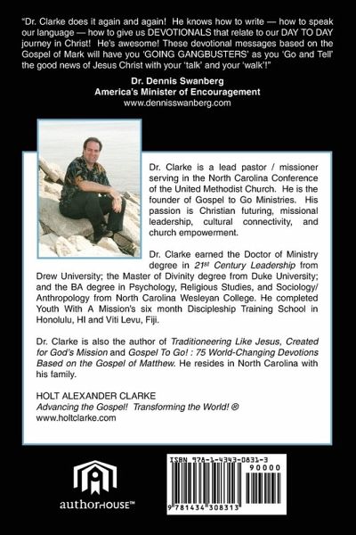 GO AND TELL! Foreword by Dr. Dennis Swanberg Holt Clarke does it again and again! He turns out devotional book after devotional book. And I can hardly wait for the next one to come out! Dr. Clarke knows how to write - how to speak our language - how to give us DEVOTIONALS that relate to our DAY TO DAY journey in Christ! He's awesome! These devotionals based on the Gospel of Mark will have you 'GOING GANGBUSTERS' as you 'Go and Tell' the good news of Jesus Christ with your 'talk' and your 'walk'! It is rare to come across a devotional book that is a 'PAGE TURNER'. With each devotional message, Dr. Clarke masterfully unpacks Mark's Gospel in way that will keep you turning the page. Take time to sit in your favorite chair with your favorite cup of coffee and Dr. Clarke's devotional book. You will have a 'Quiet Time' that 'Brews' richer and richer throughout the day with an aroma of Heaven itself! And the end result - You will 'Go and Tell'! Why? Because through these devotions you will realize you have a gospel worth sharing!! Dr. Dennis "The Swan" Swanberg America's Minister of Encouragement http://www.dennisswanberg.com