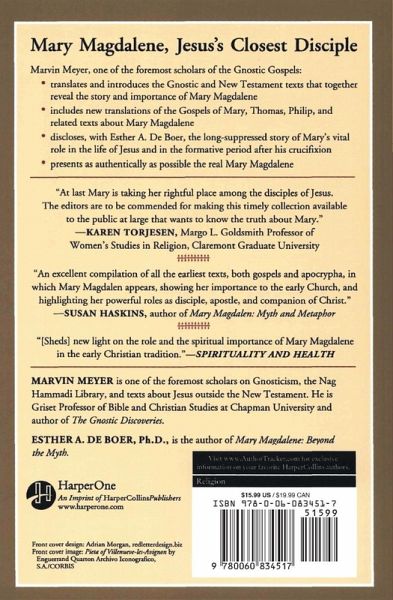 Mary Magdalene, Jesus's Closest Disciple Marvin Meyer, one of the foremost scholars of the Gnostic Gospels: * translates and introduces the Gnostic and New Testament texts that together reveal the story and importance of Mary Magdalene * includes new translations of the Gospels of Mary, Thomas, Philip, and related texts about Mary Magdalene * discloses, with Esther A. De Boer, the long-suppressed story of Mary's vital role in the life of Jesus and in the formative period after his crucifixion * presents as authentically as possible the real Mary Magdalene