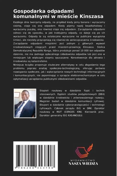 Kädego dnia tworzymy odpady, na przyk¿ad kiedy jemy banana i wyrzucamy skórk¿, staje si¿ ona odpadem. Kiedy pijemy napój bezalkoholowy i wyrzucamy puszk¿, ona równie¿ staje si¿ odpadem. Zarz¿dzanie odpadami odnosi si¿ do sposobu, w jaki traktujemy odpady, co dzieje si¿ po ich wyrzuceniu. Odpady te s¿ ostatecznie wyrzucane na publiczne wysypiska ¿mieci, ale niestety przyczyniaj¿ si¿ równie¿ do zanieczyszczenia ¿rodowiska.Zarz¿dzanie odpadami miejskimi jest jednym z g¿ównych wyzwä ¿rodowiskowych stoj¿cych przed miastem-prowincj¿ Kinszasa. Stolica Demokratycznej Republiki Konga, która produkuje ponad 10 000 ton odpadów dziennie, nie ma ¿adnego op¿acalnego sk¿adowiska odpadów lub jest ono w mniejszym lub wi¿kszym stopniu opuszczone. Konsekwencje dla zdrowia i ¿rodowiska s¿ katastrofalne.Niniejsza ksi¿¿ka proponuje skuteczne alternatywy w celu z¿agodzenia tego problemu poprzez analiz¿ spo¿eczno-technologiczn¿, oferuj¿c zarówno rozwi¿zania spo¿eczne, jak i wykorzystanie nowych technologii informacyjnych i komunikacyjnych, nie zapominaj¿c o sprz¿cie elektromechanicznym w celu optymalizacji zarz¿dzania publicznymi sk¿adowiskami odpadów.