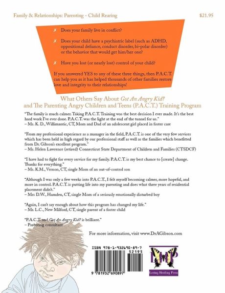 Does your family live in conflict? Does your child have a psychiatric label (such as ADHD, oppositional defiance, conduct disorder, bi-polar disorder) or the behavior that would get him/her one? Have you lost (or nearly lost) control of your child? If you answered YES to any of these three things, then PACT can help you as it has helped thousands of other families restore love and integrity to their relationships! What Others Say About Got An Angry Kid? and The PACT Training Program "The family is much calmer. Taking PACT Training was the best decision I ever made. It's the best hard work I've ever done. PACT was the light at the end of the tunnel for us." --Ms. K. D., Willimantic, CT, Mom and Dad of an adolescent girl placed in foster care "From my professional experience as a manager in the field, PACT is one of the very few services which has been held in high regard by our professional staff as well as the families which benefitted from Dr. Gibson's excellent program." --Ms. Helen Lawrence (retired) Connecticut State Department of Children and Families (CTSDCF) "I have had to fight for every service for my family. PACT is my best chance to [create] change. Thanks for everything." --Ms. K.M., Vernon, CT, single Mom of an out-of-control son "Although I was only a few weeks into PACT, I felt myself becoming calmer, more hopeful, and more in control. PACT is putting life into my parenting and does what three years of residential placement didn't." --Mrs D.W., Hamden, CT, single Mom of a seriously emotionally disturbed boy "Again, I can't say enough about how this program has changed my life." --Mr. L.C., New Milford, CT, single parent of a foster child "PACT and Got An Angry Kid? is brilliant." --Parenting consultant About the Author Dr. Gibson earned his PhD in Education at the University of Connecticut in 1987 under the tutelage of Richard Bloomer. He poured everything about his childhood and his experience as a parent went into what became Parenting Angry Children and Teens (PACT) Training and the book, "Got An Angry Kid?" In 1993, the Connecticut State Department of Children and Families adopted the PACT methodology and since then 500 families have completed the year-long program with remarkable results. For more information, visit www.DrAGibson.com From Loving Healing Press www.LovingHealing.com Family & Relationships: Parenting - Child Rearing