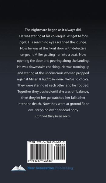 The nightmare began as it always did. He was staring at his colleague. It's got to look right. His searching eyes scanned the lounge. Now he was at the front door with detective sergeant Miller getting her into a coat. Now opening the door and peering along the landing. He was downstairs checking. He was running up and staring at the unconscious woman propped against Miller. It had to be done. We've no choice. They were staring at each other and he nodded. Together they pushed until she was off balance, then they let her go watched her fall to her intended death. Now they were at ground floor level stepping over her dead body. But had they been seen?