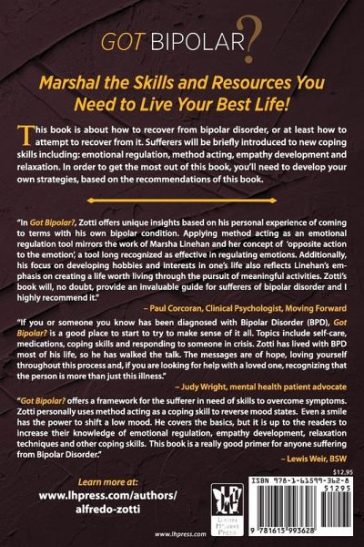 Marshal the Skills and Resources You Need to Live Your Best Life! This book is about how to recover from bipolar disorder, or at least how to attempt to recover from it. Sufferers will be briefly introduced to new coping skills including: emotional regulation, method acting, empathy development and relaxation. In order to get the most out of this book, you’ll need to develop your own strategies, based on the recommendations of this book. "In Got Bipolar?, Zotti offers unique insights based on his personal experience of coming to terms with his own bipolar condition. Applying method acting as an emotional regulation tool mirrors the work of Marsha Linehan and her concept of ‘opposite action to the emotion’, a tool long recognized as effective in regulating emotions. Additionally, his focus on developing hobbies and interests in one’s life also reflects Linehan’s emphasis on creating a life worth living through the pursuit of meaningful activities. Zotti’s book will, no doubt, provide an invaluable guide for sufferers of bipolar disorder and I highly recommend it." --Paul Corcoran, Clinical Psychologist, Moving Forward "If you or someone you know has been diagnosed with Bipolar Disorder (BPD), Got Bipolar? is a good place to start to try to make sense of it all. Topics include self-care, medications, coping skills and responding to someone in crisis. Zotti has lived with BPD most of his life, so he has walked the talk. The messages are of hope, loving yourself throughout this process and, if you are looking for help with a loved one, recognizing that the person is more than just this illness." -- Judy Wright, mental health patient advocate "Got Bipolar? offers a framework for the sufferer in need of skills to overcome symptoms. Zotti personally uses method acting as a coping skill to reverse mood states. Even a smile has the power to shift a low mood. He covers the basics, but it is up to the readers to increase their knowledge of emotional regulation, empathy development, relaxation techniques and other coping skills. This book is a really good primer for anyone suffering from Bipolar Disorder. -- Lewis Weir, BSW Learn more about the author at www.lhpress.com/authors/alfredo-zotti