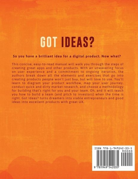 This concise, easy-to-read manual will walk you through the steps of creating great apps and other digital products. With an unwavering focus on user experience and a commitment to ongoing iteration, the authors break down all the elements and exercises that go into creating products people won’t just buy, but will love to use. You’ll learn about: The foundation of all great digital products, including finding your vision, mapping your user journey, and always mapping your strategy back to your goals How to conduct lean, mean research without a lot of time or money Which development methodology will work best for you, your product, and your scaling team Why user-centric design is integral to any successful product today The secrets to building a small, effective startup team How to bring your business model to life and attract the right investors at the right time With hands-on, tactical instruction, you’ll create the building blocks of a great product, including: Your very first proof of concept A value proposition you can commit to A tangible product workflow A feasibility audit Iterative prototypes that react to feedback and lessons learned Your first pitch deck Got Ideas? turns dreamers into viable entrepreneurs and good ideas into excellent products with great UX.