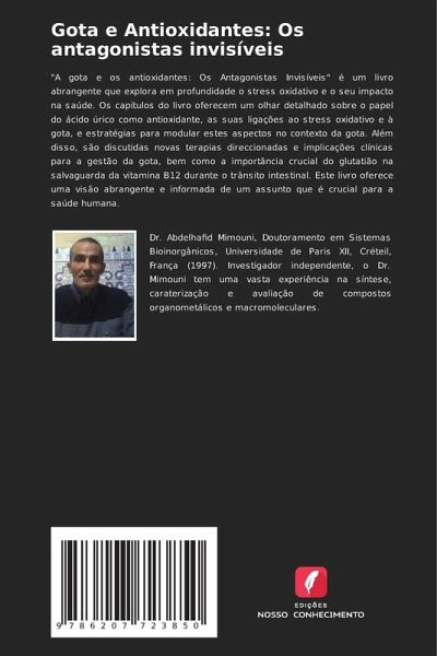 "A gota e os antioxidantes: Os Antagonistas Invisíveis" é um livro abrangente que explora em profundidade o stress oxidativo e o seu impacto na saúde. Os capítulos do livro oferecem um olhar detalhado sobre o papel do ácido úrico como antioxidante, as suas ligações ao stress oxidativo e à gota, e estratégias para modular estes aspectos no contexto da gota. Além disso, são discutidas novas terapias direccionadas e implicações clínicas para a gestão da gota, bem como a importância crucial do glutatião na salvaguarda da vitamina B12 durante o trânsito intestinal. Este livro oferece uma visão abrangente e informada de um assunto que é crucial para a saúde humana.