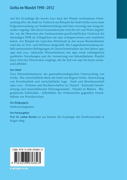 Auf der Grundlage der bereits kurz nach der Wende erschienenen Untersuchung über die Stadt im Umbruch am Beispiel der Stadt Gotha sowie einer Folgeuntersuchung zur Stadtentwicklung wird hier erstmalig eine Langzeitstudie vorgelegt. Mit dieser Gemeindestudie wird die Art und Weise abgebildet, wie die Menschen den fundamentalen gesellschaftlichen Umbruch der ehemaligen DDR im Alltagsleben seit 1990 wahrgenommen und verarbeitet haben. Am Beispiel der typischen Mittelstadt in den neuen Bundesländern wird dies in Text- und Filmform dargestellt. Die Langzeituntersuchung enthält repräsentative Befragungen als Querschnittstudien aus den Jahren 1991, 1993 und 2012, zahlreiche Filmaufnahmen seit 1990 sowie umfangreiche qualitative Forschungen und die Auswertung von Sekundärdaten. Parallel dazu wird eine Filmversion vorgelegt, die die Zeit von 1990 bis heute umfassend abbildet.