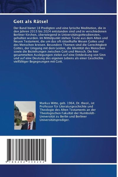 Der Band bietet 18 Predigten und eine lyrische Meditation, die in den Jahren 2015 bis 2024 entstanden sind und in verschiedenen Berliner Kirchen, überwiegend in Universitätsgottesdiensten, gehalten wurden. Im Mittelpunkt stehen Texte aus dem Alten und Neuen Testament, die um das oft rätselhafte Wesen Gottes und des Menschen kreisen. Besondere Themen sind die Gerechtigkeit Gottes, der Umgang mit dem Leiden, die Identität des Menschen sowie die Beziehungen zwischen Gott und Mensch. Die hier gesammelten Auslegungen zielen auf eine Entdeckung von Sinn und auf eine Deutung des eigenen Lebens als einer Geschichte vielfältiger Begegnungen mit Gott.