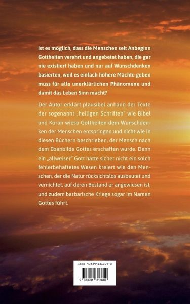 Ist es möglich, dass die Menschen seit Anbeginn Gottheiten verehrt und angebetet haben, die gar nie existiert haben und nur auf Wunschdenken basierten, weil es einfach höhere Mächte geben muss für alle unerklärlichen Phänomene und damit das Leben Sinn macht?Der Autor erklärt plausibel anhand der Texte der sogenannt «heiligen Schriften» wie Bibel und Koran wieso Gottheiten dem Wunschdenken der Menschen entspringen und nicht wie in diesen Büchern beschrieben, der Mensch nach dem Ebenbilde Gottes erschaffen wurde. Denn ein «allweiser» Gott hätte sicher nicht ein solch fehlerbehaftetes Wesen kreiert wie den Menschen, der die Natur rücksichtslos ausbeutet und vernichtet, auf deren Bestand er angewiesen ist, und zudem barbarische Kriege sogar im Namen Gottes führt.
