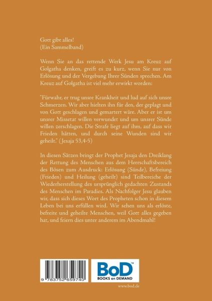 Gott gibt alles!(Ein Sammelband)Wenn Sie an das rettende Werk Jesu am Kreuz auf Golgatha denken, greift es zu kurz, wenn Sie nur von Erlösung und der Vergebung Ihrer Sünden sprechen. Am Kreuz auf Golgatha ist viel mehr erwirkt worden:"Fürwahr, er trug unsre Krankheit und lud auf sich unsre Schmerzen. Wir aber hielten ihn für den, der geplagt und von Gott geschlagen und gemartert wäre. Aber er ist um unsrer Missetat willen verwundet und um unsrer Sünde willen zerschlagen. Die Strafe liegt auf ihm, auf dass wir Frieden hätten, und durch seine Wunden sind wir geheilt." (Jesaja 53,4-5)In diesen Sätzen bringt der Prophet Jesaja den Dreiklang der Rettung des Menschen aus dem Herrschaftsbereich des Bösen zum Ausdruck: Erlösung (Sünde), Befreiung (Frieden) und Heilung (geheilt) sind Teilbereiche der Wiederherstellung des ursprünglich gedachten Zustands des Menschen im Paradies. Als Nachfolger Jesu glauben wir, dass sich dieses Wort des Propheten schon in diesem Leben bei uns erfüllen wird. Wir sehen uns als erlöste, befreite und geheilte Menschen, weil Gott alles gegeben hat, und feiern dies unter anderem im Abendmahl!