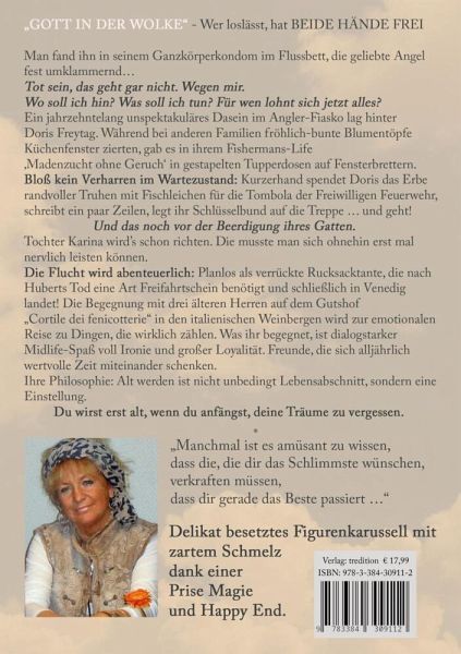 "GOTT IN DER WOLKE" - Wer loslässt, HAT BEIDE HÄNDE FREIMan fand ihn in seinem Ganzkörperkondom im Flussbett, die geliebte Angel fest umklammernd...Hubert Freytag war meine Backfischliebe. Tot sein, das geht gar nicht. Wegen mir.Wo soll ich hin? Was soll ich tun? Für wen lohnt sich jetzt alles?Ein jahrzehntelang unspektakuläres Dasein im Angler-Fiasko inclusive Fischfangbearbeitung lagen hinter Doris Freytag. Während bei anderen Familien fröhlich-bunte Blumentöpfe Küchenfenster zierten, gab es in ihrem Fishermans-Life 'Madenzucht ohne Geruch' in gestapelten Tupperdosen auf Fensterbrettern.Bloß kein Verharren im Wartezustand: Kurzerhand spendet Doris das Erbe randvoll mitFischleichen gefüllter Truhen für die Tombola der Freiwilligen Feuerwehr, schreibt ein paar Zeilen, legt ihr Schlüsselbund auf die Treppe ... und geht!Und das noch vor der Beerdigung ihres Gatten...Tochter Karina wird's schon richten. Die musste man sich ohnehin erst mal nervlich leisten können.Die Flucht wird abenteuerlich: Planlos überrumpelt vom Dasein als verrückte Rucksacktante, die nach dem Tod ihres Gatten für einige Monate eine Art Freifahrtschein genießt und schließlich in Venedig landet!Die Begegnung mit drei älteren Herren auf einem Gutshof in den italienischen Weinbergen wird letztendlich zur emotionalen Reise zu Dingen, die wirklich zählen.Was ihr begegnet, ist dialogstarker Midlife-Spaß voll Ironie und großer Loyalität. Humorvolle Menschen, die einen gewissen Abstand zu sich selbst haben. Freunde, die sich alljährlich wertvolle Zeit miteinander schenken.Ihre Philosophie: Alt werden ist nicht unbedingt Lebensabschnitt, sondern eine Einstellung.Du wirst erst alt, wenn du anfängst, deine Träume zu vergessen!"Nach und nach löste sich der Staub von meiner Seele. Glück, Sinnhaftigkeit erlebst du nicht am Ende deiner Reise - sondern unterwegs." _Delikat besetztes Figurenkarussell mit zartem Schmelz dank einer Prise Magie und Happy End."Manchmal ist es amüsant zu wissen, dass die, die dir das Schlimmste wünschen,verkraften müssen, dass dir gerade das Beste passiert...""GOTT IN DER WOLKE" bietet nicht nur Unterhaltung, sondern regt auch zum Nachdenken an. Es thematisiert relevante Fragen zu Verlust, Freundschaft und der Suche nach Lebensfreude in der Lebensmitte. Leser können sich auf eine humorvolle Erzählweise freuen, die tiefgründige Einsichten in die menschliche Psyche vermittelt und die Kraft des Neuanfangs feiert. _