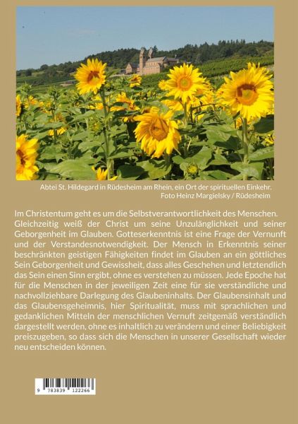 Im Christentum geht es um die Selbstverantwortlichkeit des Menschen. Gleichzeitig weiß der Christ um seine Unzulänglichkeit und seiner Geborgenheit im Glauben. Gotteserkenntnis ist eine Frage der Vernunft und der Verstandesnotwendigkeit. Der Mensch in Erkenntnis seiner beschränkten geistigen Fähigkeiten findet im Glauben an ein göttliches Sein Geborgenheit und Gewissheit, dass alles Geschehen und letztendlich das Sein einen Sinn ergibt, ohne es verstehen zu müssen. Jede Epoche hat für die Menschen in der jeweiligen Zeit eine für sie verständliche und nachvollziehbare Darlegung des Glaubensinhalts. Der Glaubensinhalt und das Glaubensgeheimnis, hier Spiritualität, muss mit sprachlichen und gedanklichen Mitteln der menschlichen Vernunft zeitgemäß verständlich dargestellt werden, ohne es inhaltlich zu verändern und einer Beliebigkeit preiszugeben, so dass sich die Menschen in unserer Gesellschaft wieder neu entscheiden können.